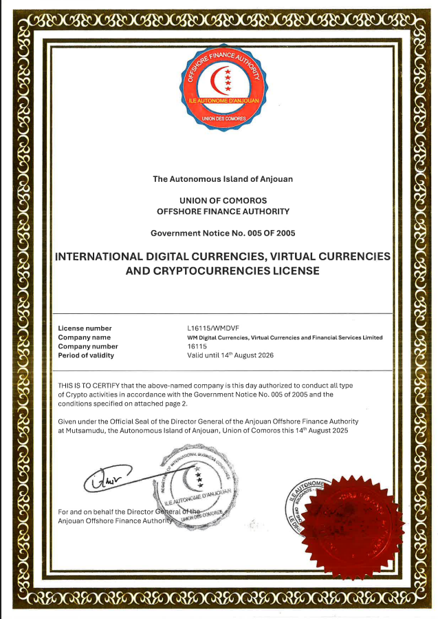 This License Verification page is provided as a service to verify the present licensing status of the Company and Website named above , who operates under license reference L16115/WMDVF Anjouan Corporate Services